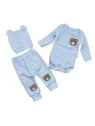 Acest set pentru bebelusi in 3 piese este alegerea ideala pentru parintii care cauta o tinuta completa, confortabila si adorabila pentru micutul lor. Setul contine un body cu maneci lungi, o pereche de pantaloni si o caciulita, toate realizate in tonuri delicate de bleu si decorate cu un imprimeu dragalas cu ursulet.